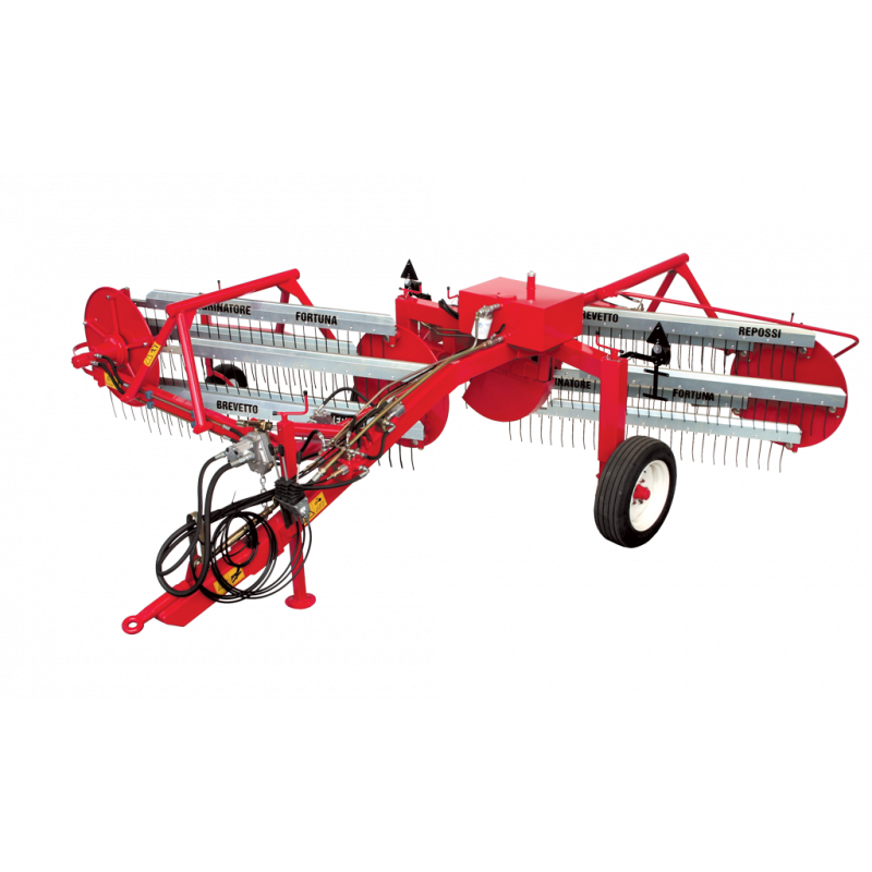 Andaineur à andain central qui peuvent être portés aussi bien par l’élévateur arrière que par l’élévateur avant, avec 10 rabatteurs actionnés par le dispositif hydraulique du tracteur (version sans dispositif hydraulique indépendant) ou bien par le dispositif hydraulique indépendant. Trois roues principales Ballons 18,5 x 8,50-8 et deux roues externes 16 x 6,50-8, toutes réglables en hauteur par vis..