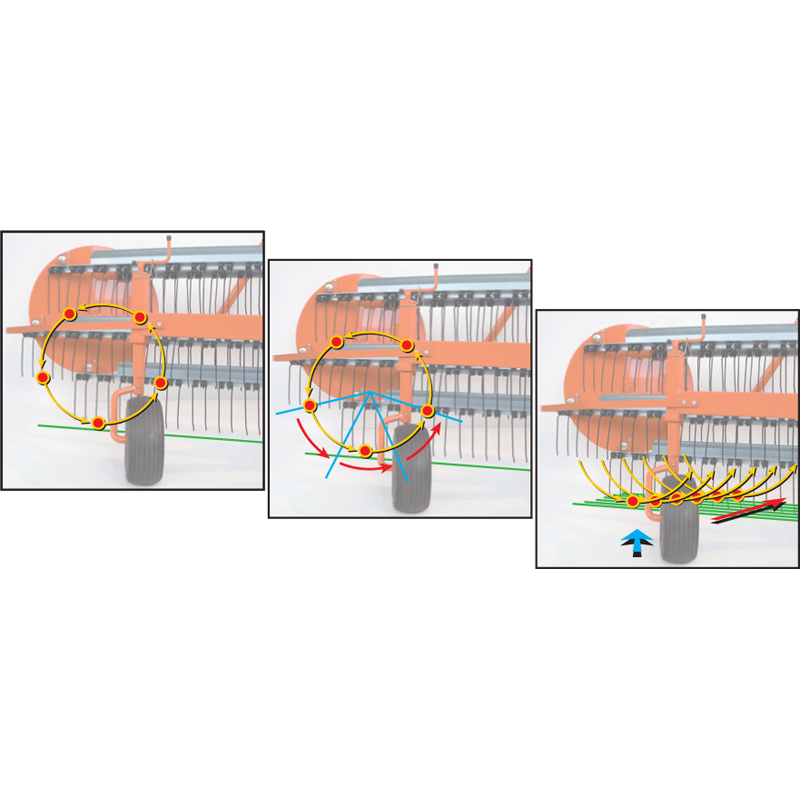 Andaineur à peignes porté hydraulique à montage arrière avec un groupe d’andainage. Doté d’un dispositif hydraulique indépendant avec pompe à raccorder directement à la prise de force du tracteur qui actionne le mouvement des peignes avec position andainage et éparpillement d’andain. Attelage trois-points oscillant (avec réglage de l’amplitude du débattement). Trois roues pivotantes réglables en hauteur par vis.
