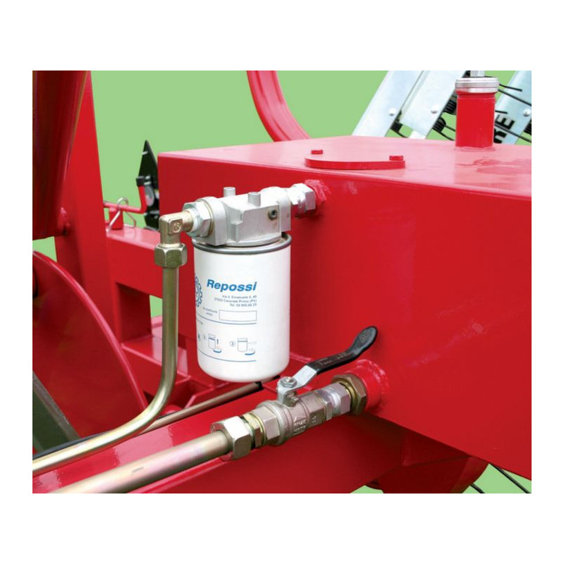 Andaineur à 10 rabatteurs, commandé depuis le poste de conduite du tracteur, qui forme des andains latéraux compacts sur le côté gauche en ordre de marche. Doté d’un dispositif hydraulique indépendant, avec une pompe pouvant être raccordée à la prise de force du tracteur, qui alimente le système hydraulique pour la rotation des rabatteurs. Les vérins qui lèvent et baissent les roues et les deux groupes d’andainage sont actionnés par les distributeurs du tracteur.
