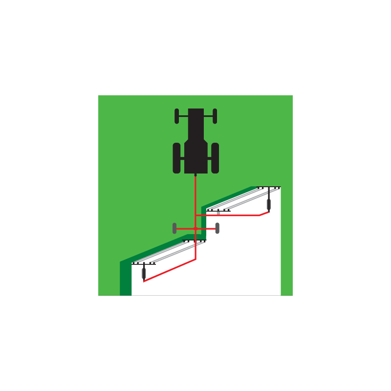 3) Double andain latéral – travaillent le groupe avant droit et le groupe arrière positionné de manière à former deux andains latéraux distincts