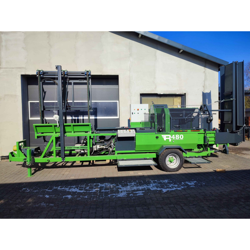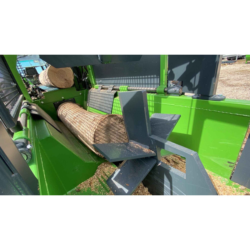 Il dispose de coins de fendage 2/4 et 6 à positionnement hydraulique, d’un tapis d’alimentation repliable (1,60 x 280 mm), et d’un tapis receveur hydraulique de 5 m avec barrettes en acier.