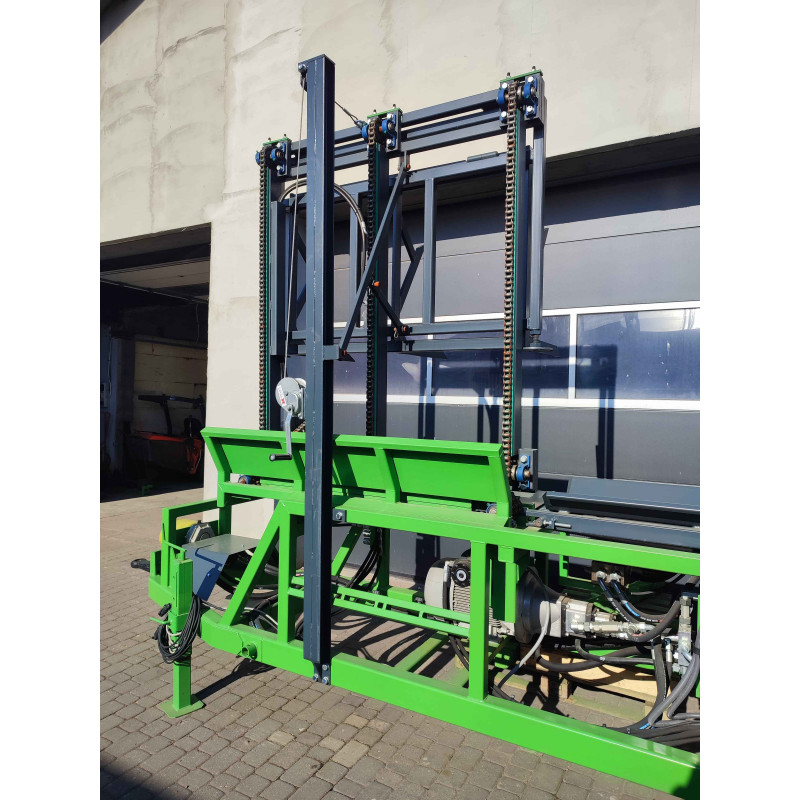 Il est équipé d’un deck à chaînes télescopique (3 x 2000 mm), de coins de fendage 2/4 et 6 à positionnement hydraulique, d’un tapis d’entrée à 6 rouleaux dentés (4000 x 500 mm), et d’un tapis receveur télescopique de 5 m avec barrettes en acier.