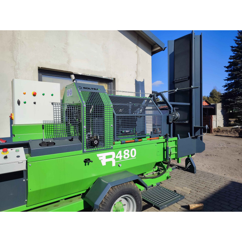 Le combiné à bois R400 PRO ROLTRAC offre un passage de 38 cm, une puissance de 12 T, et permet de scier et fendre en simultané grâce à son joystick de sciage.